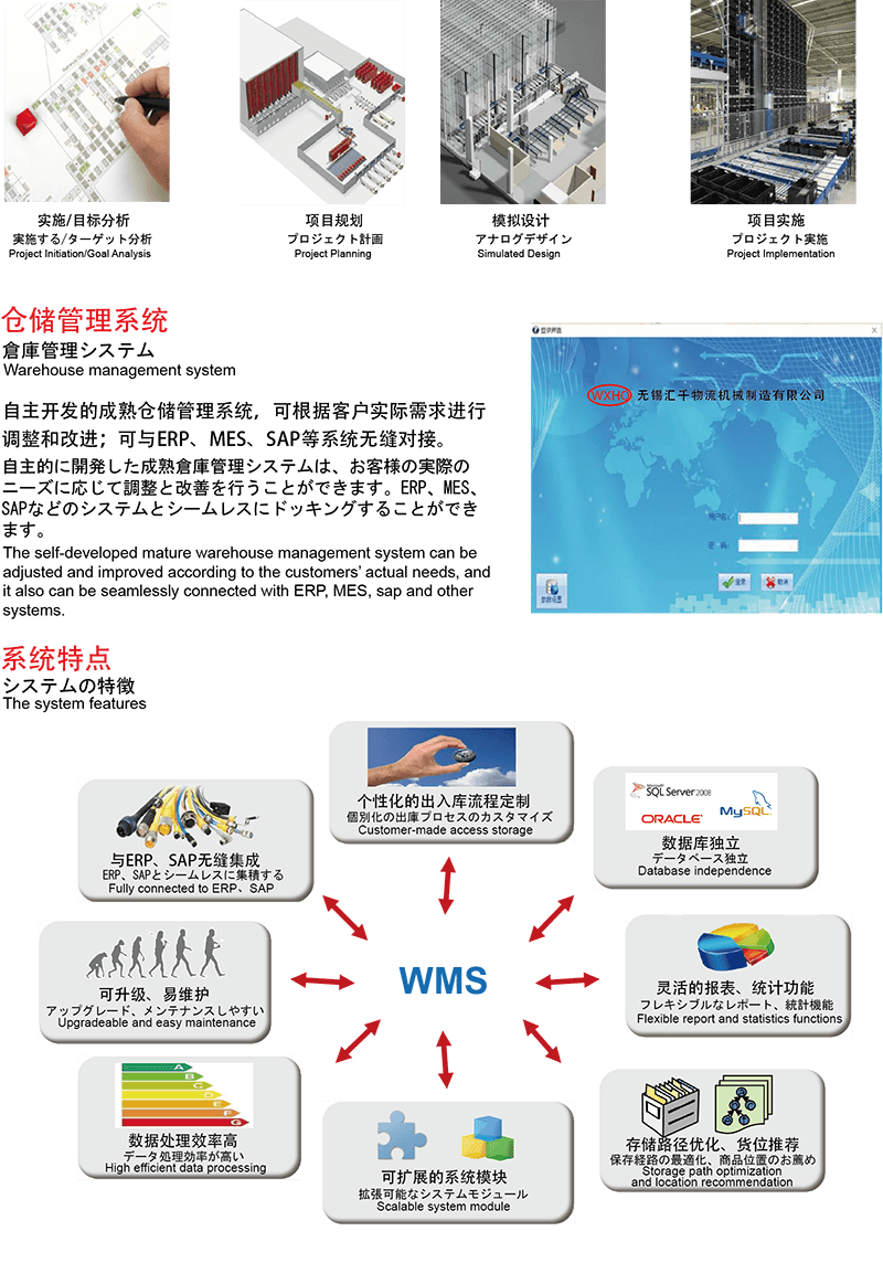 Pusat dari pendekatan Wuxi Huiqian adalah Sistem Manajemen Gudang Lanjutan (WMS), platform fleksibel yang dapat disesuaikan untuk memenuhi kebutuhan spesifik setiap pelanggan. Sistem yang dikembangkan sendiri ini terintegrasi mulus dengan ERP, MES, SAP, dan alat manajemen bisnis lainnya, memungkinkan pelacakan waktu nyata, kontrol inventaris, dan visibilitas data yang ditingkatkan. Dengan menawarkan fitur modular seperti manajemen penyimpanan masuk dan keluar, pemeliharaan sistem, dan kemampuan kueri data, WMS mendukung bisnis dalam mengelola segala sesuatu mulai dari fungsi gudang dasar hingga tugas logistik yang lebih kompleks.